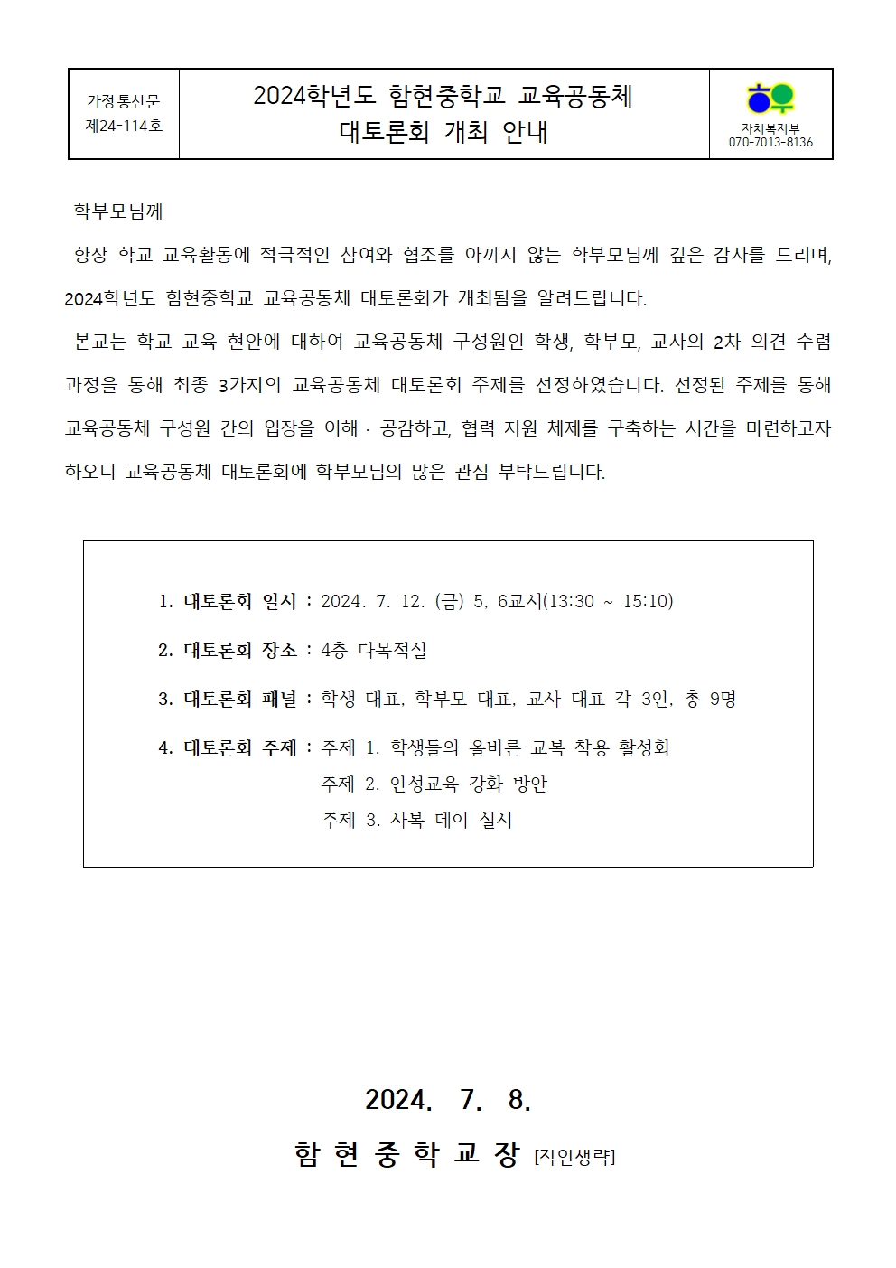 [ÀϹÝ] 2024Çг⵵ ÇÔÇöÁßÇб³ ±³À°°øµ¿Ã¼ ´ëÅä·Ðȸ °³ÃÖ ¾È³»ÀÇ Ã·ºÎÀ̹ÌÁö 1