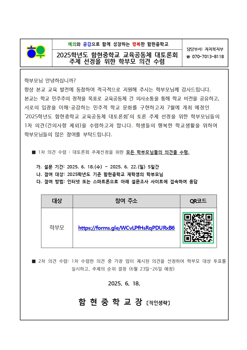 [ÀϹÝ] _2025Çг⵵ ÇÔÇöÁßÇб³ ±³À°°øµ¿Ã¼ ´ëÅä·Ðȸ ÁÖÁ¦ ¼±Á¤À» À§ÇÑ Çкθð ÀÇ°ß ¼ö·Å