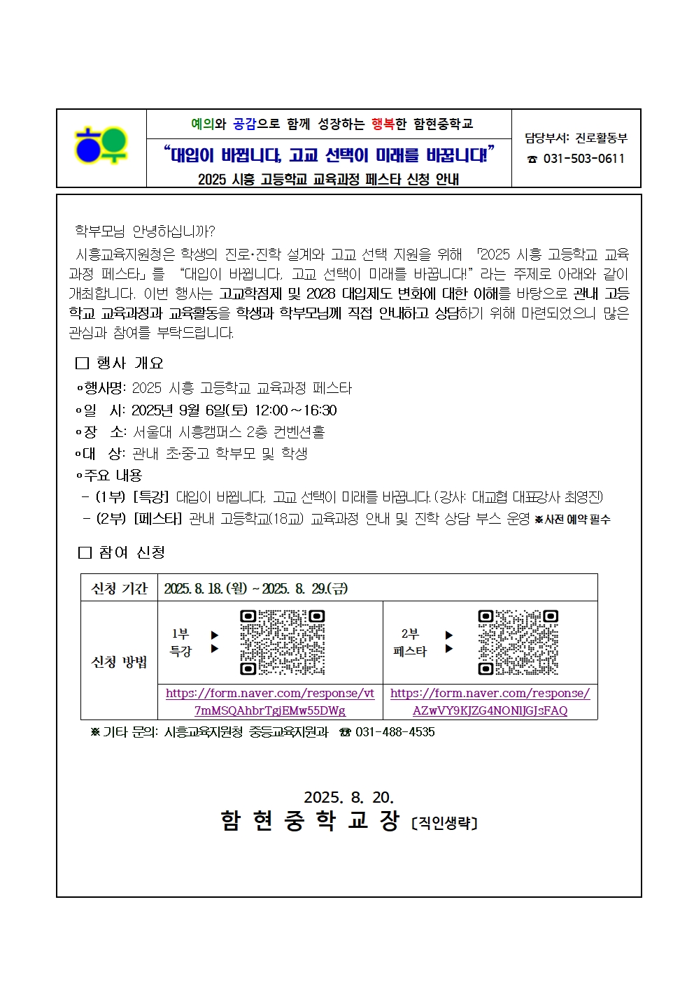°¡Á¤Åë½Å¹®(0820)_2025 ½ÃÈï °íµîÇб³ ±³À°°úÁ¤ Æä½ºÅ¸ ½Åû ¾È³».hwpx (124.94KB)