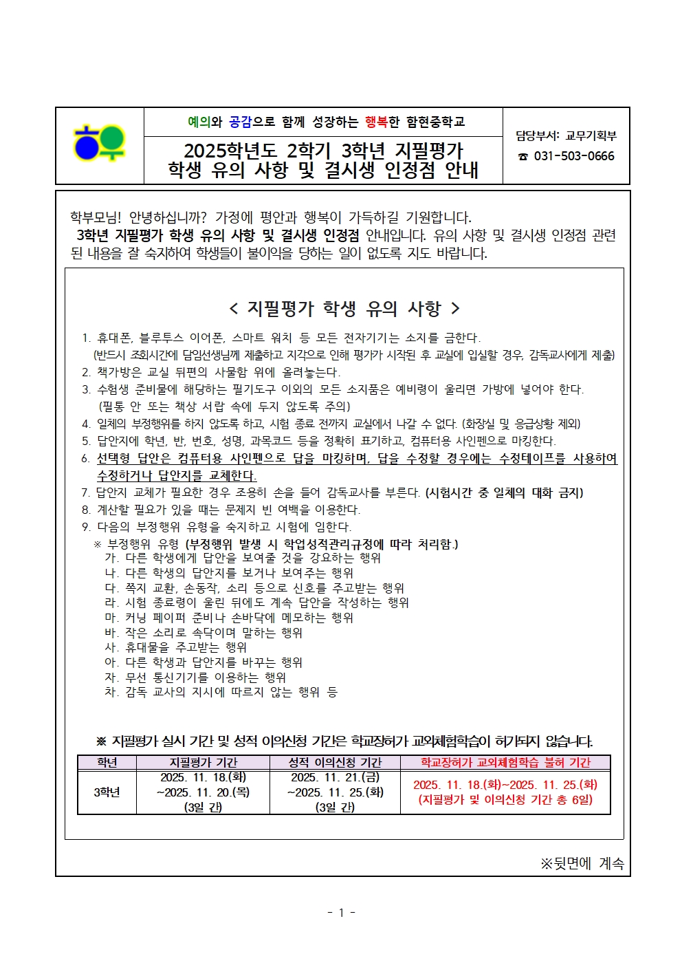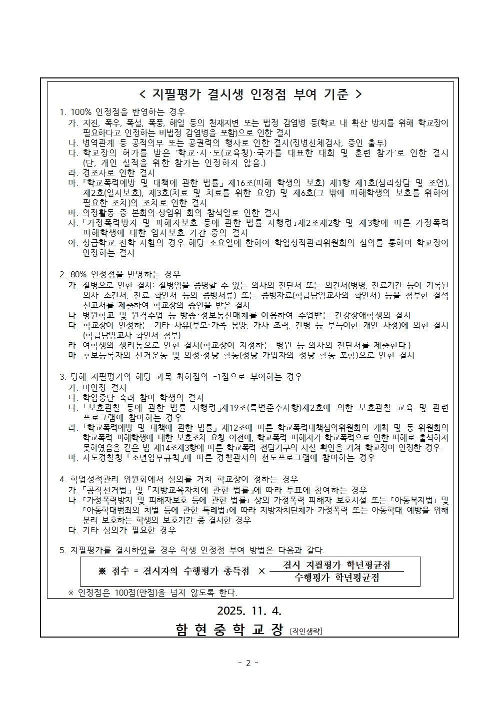 °¡Á¤Åë½Å¹®(1104)_2025Çг⵵ 2Çбâ 3Çгâ ÁöÇÊÆò°¡ Çлý À¯ÀÇ »çÇ× ¹× °á½Ã»ý ÀÎÁ¤Á¡ ¾È³».hwpx (90.16KB)