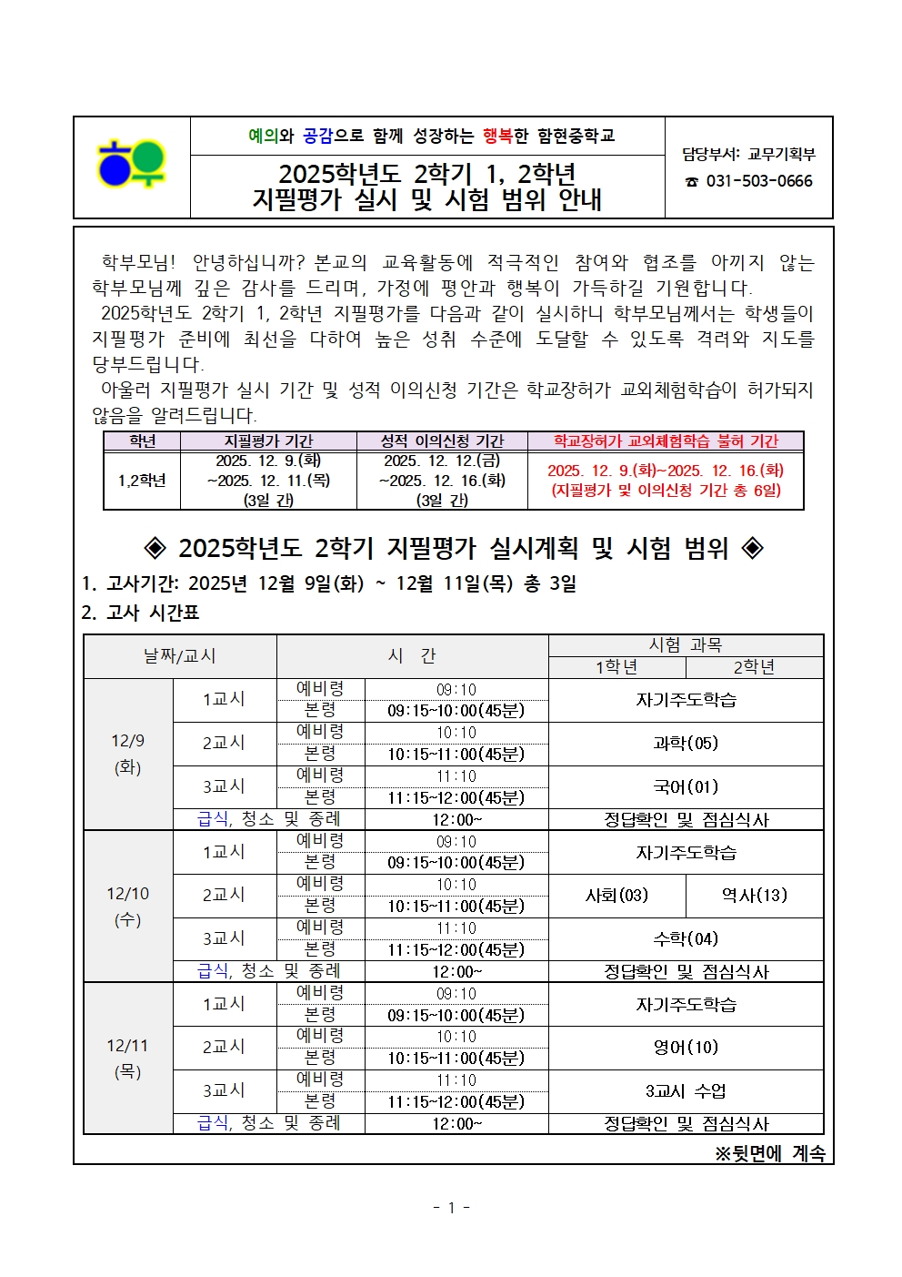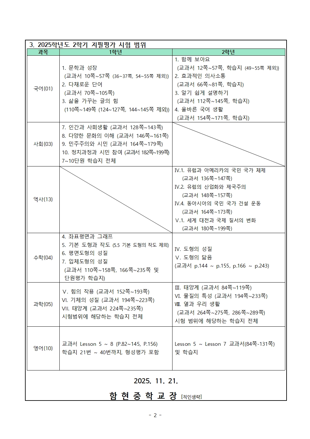 °¡Á¤Åë½Å¹®(1121)_2025Çг⵵ 2Çбâ 1, 2Çгâ ÁöÇÊÆò°¡ ½Ç½Ã ¹× ½ÃÇè ¹üÀ§ ¾È³».hwpx (83.98KB)